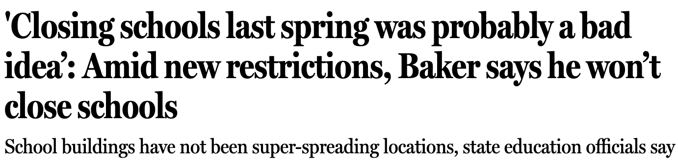 Although sidelined a bit this week, the politics of open school buildings continues in Massachusetts (for example, Charlestown parents, Brookline strike), New York, and even on school buses. The aftermath of the election, not COVID-19, caused remote learning in Swampscott yesterday. With more data available and competing interests, maybe it is all still just about trust and varied experiences of the pandemic (race matters).